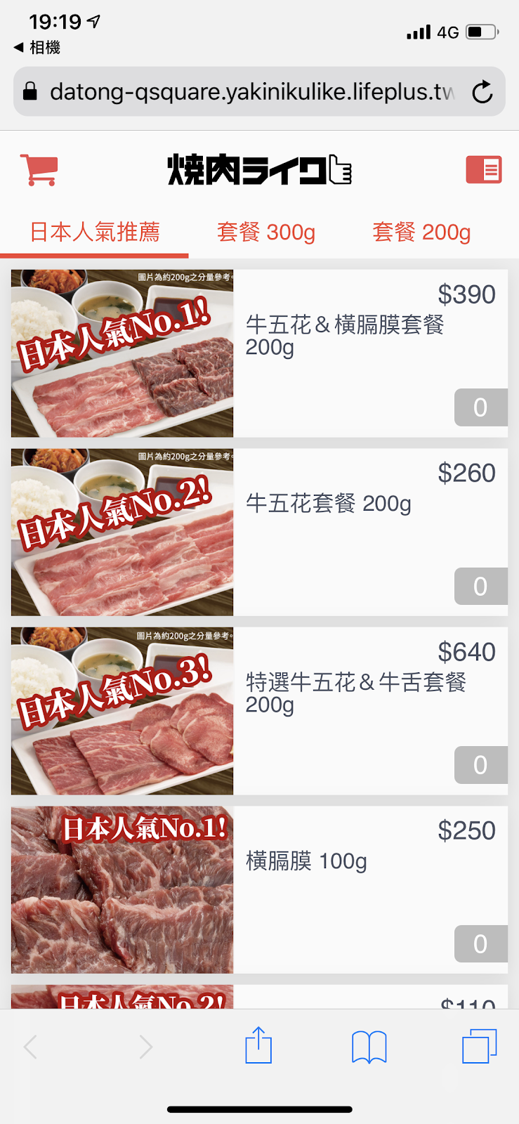 菜單往左滑會出現套餐300g(只有一品) 200g 單點、小菜、飲料等等