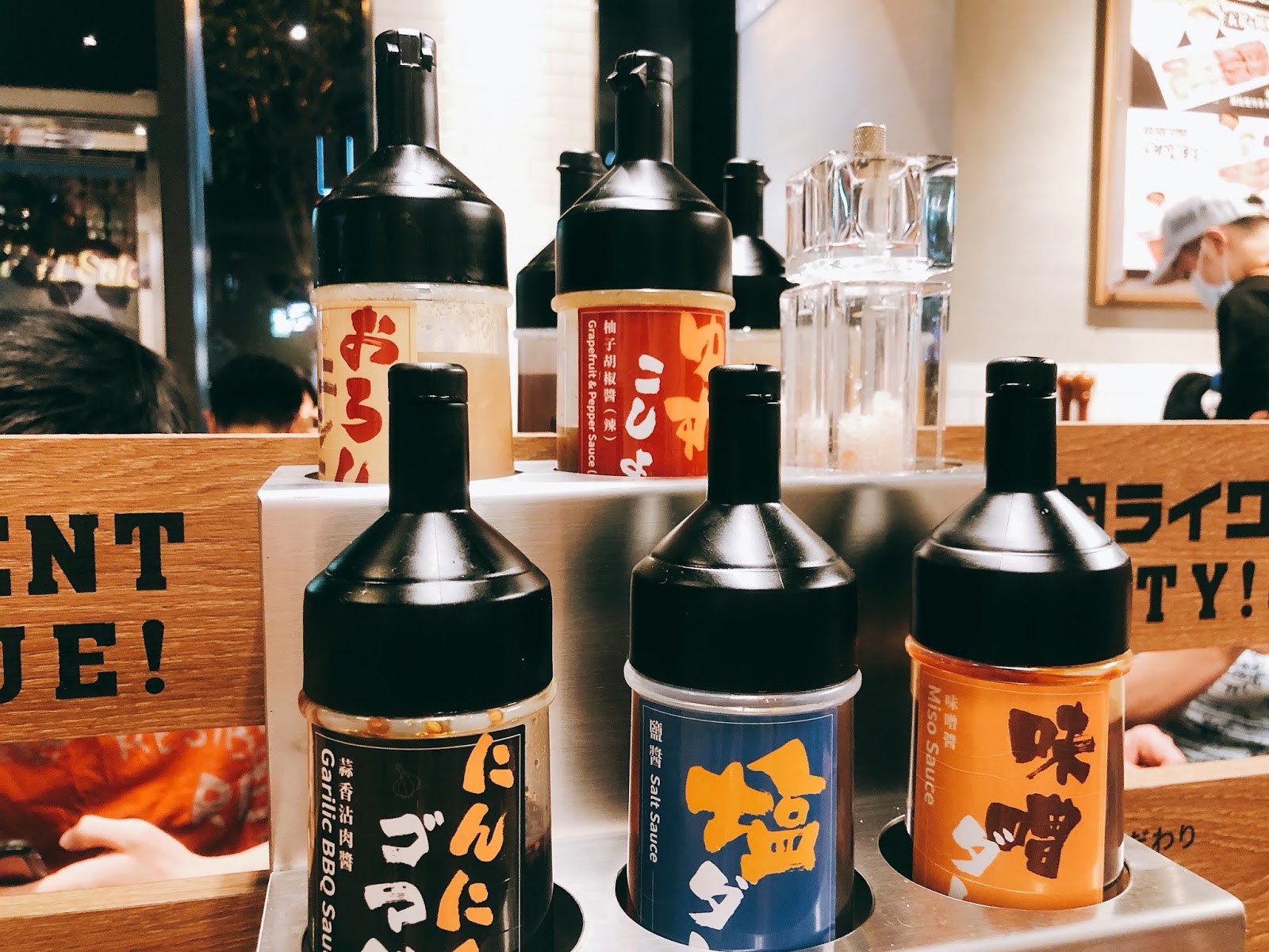 分別是味噌、鹽醬、蒜香沾肉醬、 蒜味醬、柚子胡椒、和鹽